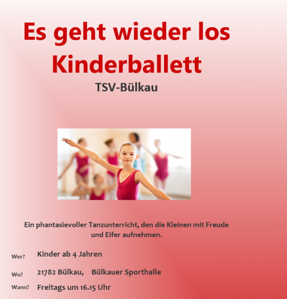 Ab Januar 2023 bieten wir wieder eine Kinderballett Stunde für Anfängerinnen und Anfäger ab einem Alter von vier Jahren an. Dieses findet freitags ab 16:15 Uhr wie gewohnt mit Tamara Koch in der Bülkauer Sporthalle statt. Schaut gerne mal vorbei. Weitere Infos gibt es hier.